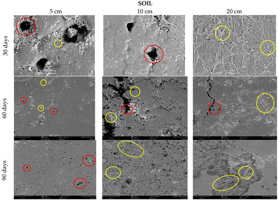 Figure 9 clearly shows the deterioration of all the samples buried in the soil, compared to the reference image (Figure 8). For the first 30 days, at depths of 5 and 10 cm, there is evidence of loss of homogeneity in the surface and the presence of quite visible holes (red circles), in contrast to the depth of 20 cm, which can be attributed mainly to microbial action and fungal growth that were perceived when the samples were obtained (Figure 10). The characteristics of the worked clay loam soil allow the formation of conglomerates, and, as a consequence, its humidity conditions can vary at a few centimeters distance, since the soil dries more easily towards the surface and retains more water as the depth increases, generating a distinction in bacterial growth, which could explain the differences in the micrographs at 5, 10, and 20 cm depths, where the fibers of fique at the last level are more exposed (yellow circles, Figure 9). When the analysis is made for 60 and 90 days, it is observed that the external damage increases, with the presence of holes and craters, which means the surface was eroded again due to the microorganisms and the deterioration of the material, given the humidity conditions of the media.