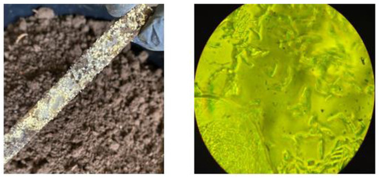 Photographic evidence of the presence of a fungus on the surface of the biocomposite; microscopic image of the fungus at 100× magnification.