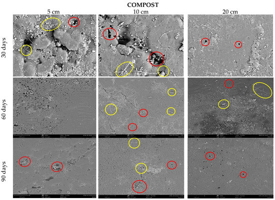Figure 11 shows the deterioration of the samples buried in the compost; as in the soil at the first 30 days, erosion is evident at 5 and 10 cm depths, there are holes (red circles), and the fiber begins to be visible (yellow circles), and at 20 cm, there seems to be less superficial damage. Campos A. et al. characterized a TPS/PCL matrix with 10% sisal fibers and studied its degradation. In their micrographs, they found the formation of agglomerates and the superficial appearance of fibers as a result of the poor interfacial adhesion of the matrix fiber, which contributed to the degradation of their mixture [50,51].