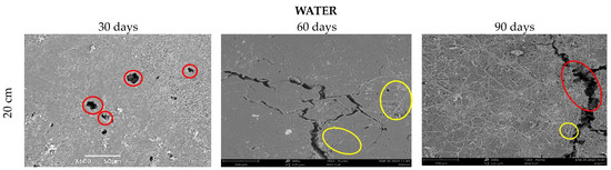 In the case of the aqueous media (Figure 12), the samples were kept at the same depth (20 cm), and thanks to the hydrolytic degradation, it is observed that the fibers are gradually exposed from 30 to 90 days of conditioning. Likewise, holes can be seen on the surface, probably due to the fact that the contact of the polymer with the aqueous media promotes water molecules penetrating into the matrix of the material, causing its swelling, rupture of the hydrogen bonds, and finally the hydrolysis of the unstable bonds, which ends up weakening the biocomposite material [52]. The images obtained with SEM equipment do not provide quantitative information about the degradation process.
