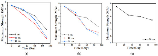 Maximum biocomposite tensile strength (TPS/PCL/F) over a period of 90 days in the degradation media: (a) Soil; (b) Compost; and (c) Water.