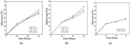 Mass loss profile for the biocomposite (TPS/PCL/F) over a period of 90 days in the degradation media: (a) Soil; (b) Compost; and (c) Water.