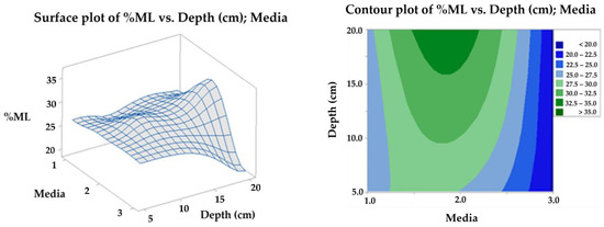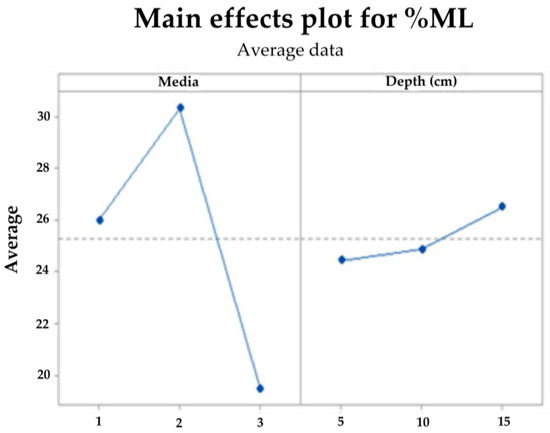 With the mass loss data, an analysis of variance (ANOVA) was performed with a confidence level of 95%, comparing the results at 90 days for the three levels, soil, compost, and water (media 1, 2, and 3, respectively). Due to the mixture of effects contributing to degradation, there is a significant difference between the levels evaluated in soil (soil and compost) and those of the aqueous media, whose mass loss does not exceed the mean of 20%, this being the worst scenario for the final disposal of the biomaterial. In contrast, the best result was achieved with the compost at 20 cm depth, followed by the same media at 10 cm, as shown in the contour plots surface (Figure 16) and main effects (Figure 17) for the response variable. The above effect is probably a consequence of the higher microbial activity in media 2, as can be seen in Figure 3, together with its clay characteristics.