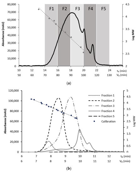As early as 1969, Kirk et al. considered the preparative size-exclusion chromatography (SEC) fractionation of lignin using gel permeation chromatography (GPC) as an effective approach for collecting lignin fractions solely based on molecular size [45]. An apparent advantage of this method is that the molecular size cut-offs can readily be controlled by varying the retention-time windows for fraction collection post-SEC processing. Furthermore, SEC is known to be a scalable technique [54].
