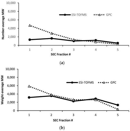 Comparison of SEC vs. ESI-TOF HR MS number-average and weight-average molecular weights for all lignin fractions. (a) Mn and (b) Mw.