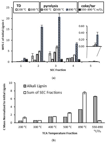 TCA analysis: (a) Carbon % distribution among the TCA temperature portions for each lignin fraction; the insert in panel (a) shows magnified fraction 5. (b) Carbon mass sums for all SEC fractions at each temperature step of TCA compared to the corresponding alkali lignin carbon masses.