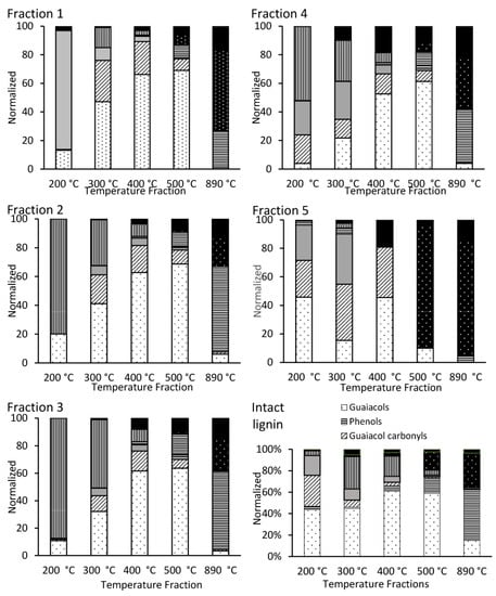 With a further increase in temperature, other pyrolytic products—phenols, aromatic hydrocarbons and, ultimately, polycyclic aromatics (mostly retene and phenanthrenes)— appeared as immediate structural char precursors that became most abundant in the final, 890 °C temperature step. Approaching this temperature, the aromatic and polycyclic hydrocarbons became dominant in fraction 5, although they were abundant in all the fractions. These results are in agreement with those of Shao et al., who observed a more abundant formation of phenols and aromatic hydrocarbons upon the high-temperature (800 °C) pyrolysis of high-MW lignin components [73]. On the other hand, they are also consistent with the observation of Li et al., that polycyclic hydrocarbons tend to form as a result of the pyrolysis of low-MW lignin components [74].