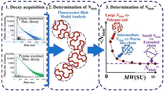 One such technique was recently presented using a methodology based on pyrene excimer formation (PEF) between an excited and a ground-state pyrenyl label covalently attached to a macromolecule. Since PEF is a chemical reaction, its efficiency depends on the local concentration ([Py]loc) of ground-state pyrenes found within the macromolecular volume [14]. This dependency was recently established by demonstrating that the average rate constant (<k>) for PEF between pyrenyl labels attached to a macromolecule is directly proportional to [Py]loc [15]. Since the experimentalist knows where the pyrenyl labels are attached on the pyrene-labeled macromolecule (PyLM), [Py]loc reflects the local density of a PyLM, thus enabling the application of PEF to determine lp. The PEF-based methodology that was developed to determine lp uses polymers that were randomly labeled with pyrene and whose fluorescence decays were fitted according to the fluorescence blob model (FBM) [16]. Within the framework of the FBM, an excited pyrenyl label only probes a subvolume, also referred to as a blob, of the much larger polymer coil. The blob is then used as a unit volume to compartmentalize the polymer coil into a cluster of blobs among which the pyrenyl labels distribute themselves randomly with a Poisson distribution. As for any blob-based method, the use of blobs shifts the study from the entire polymer to that of a blob, eliminating problems associated with polydisperse samples, that often plague scattering studies [17,18] since a large or small polymer can be described by many or few identical blobs [19]. The FBM analysis of the fluorescence decays yields the average number <n> of pyrenyl groups per blob, which is used to determine the number Nblob of SU per blob. Since a flexible polymer can pack more SU inside a blob than a stiffer polymer, Nblob is larger for a flexible polymer than for a stiffer polymer and thus responds to lp.