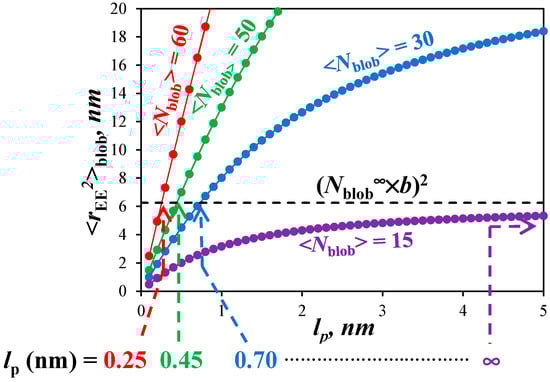 Once <Nblob> and Nblob∞ are determined, their values are introduced into Equation (3), which is a modified version of the Kratky–Porod equation (KPE) for worm-like chains to account for the fact that it is applied to the chain segment inside a blob instead of the entire chain. The left part of the KPE in Equation (3) represents the square of the end-to-end distance (<rEE2>blob) of the chain fragment encompassed inside a blob. Since the pyrene moiety is connected to the polymethacrylate backbone with the same linker for all PyEG5-PEGnMA constructs, all PyEG5-PEGnMA samples share a same blob regardless of side chain length. According to this reasoning, <rEE2>blob takes the same value for all PyEG5-PEGnMA samples including those samples that have an infinitely long side chain for which the polymethacrylate backbone is fully extended. The fully extended polymethacrylate backbone corresponds to a hypothetical PyEG5-PEGnMA sample, for which n and MW(SU) take infinitely large values and Nblob tends to Nblob∞ as shown in the right panel of Figure 1. For a fully extended chain segment inside a blob, <rEE2>blob equals the product (Nblob∞ × b)2, where b is the length of a methacrylate structural unit equal to 0.25 nm [25,26]. Since all PyEG5-PEGnMA share the same blob with <rEE2>blob = (Nblob∞ × b)2, the left-hand side of the KPE is known and the function on the right-hand side of the equation can be solved for lp as represented in Figure 2. The <Nblob> value obtained for each PyEG5-PEGnMA series is entered into the right-hand side of the KPE, which is plotted as a function of lp in Figure 2. The abscissa of the intercept between the horizontal dashed line representing <rEE2> = (Nblob∞ × b)2 and the line corresponding to the right-hand side of the KPE yields lp for the PyEG5-PEGnMA series under consideration.