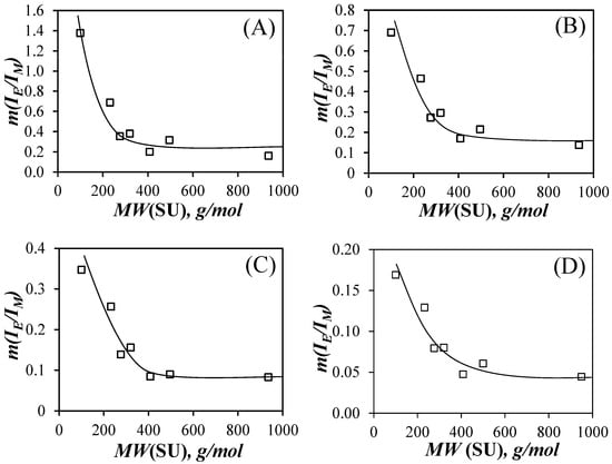 Plot of m(IE/IM) versus MW(SU) for the PyEG5-PEGnMA PBBs in (A) acetonitrile, (B) THF, (C) DMF, and (D) DMSO.