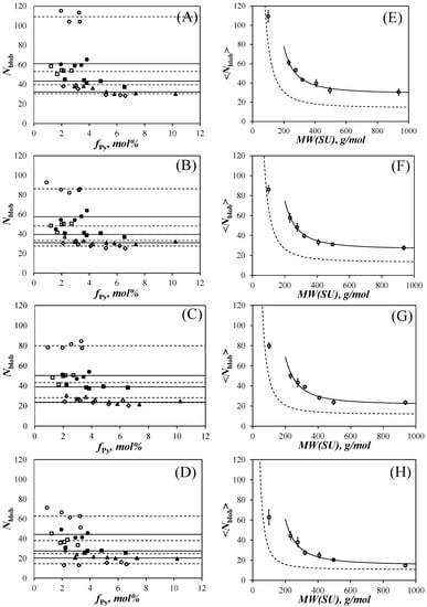 The new trends pass through most of the data points including the <Nblob> value for PyEG5-PEG0MA. Instead of <Nblob> tending to infinity for infinitely small side chains, <Nblob> goes through an inflection point as it approaches MW(SU) = 100 g/mol for poly(methyl methacrylate) before passing through a maximum and intercepting the Y-axis at a finite, non-zero value. The small dip observed for short side chains before the maximum in the plots of Figure 8 is certainly an artefact resulting from the mathematical handling of the Kratky–Porod equation with the linear relationship between lp and NS2 in Figure 7 to predict <Nblob>. Despite this mathematical artefact, the plots of <Nblob>-vs-MW(SU) in Figure 8 provide a physically more realistic depiction of the behavior of <Nblob> expected as the side chains become infinitely short, because <Nblob> no longer diverges to infinity as would be otherwise predicted with Equation (8).