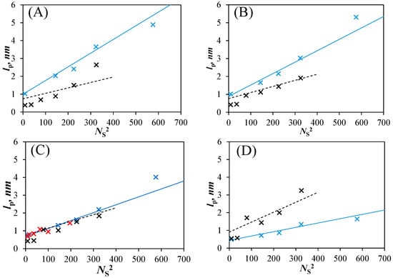 Plot of lp as a function of NS2 for the (×) PyEG5-PEGnMA and (×) PyBut-PEGnMA samples in (A) acetonitrile for PyPEG5-PEGnMA and acetone for PyBut-PEGnMA, (B) THF, (C) DMF, and (D) DMSO. (×) lp values obtained for a series of poly(alkyl methacrylate) [11]. Lines: (solid blue) predicted lp values for the PyPEG5-PEGnMA samples based on Equations (3)–(8) and (dashed black) predicted values for the PyBut-PEGnMA samples [20].