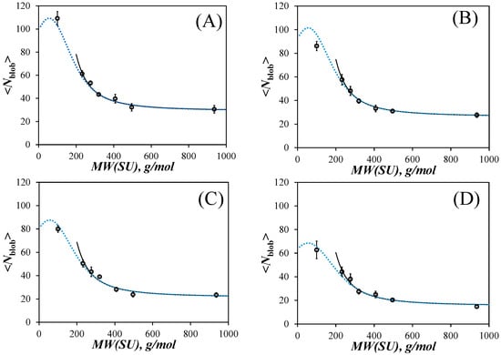 In order to properly predict the <Nblob> values that should be obtained for polymethacrylates having short side chains, Equations (9) and (10) were used to parametrize the intercepts and slopes of the lp-vs-NS2 straight lines in Figure 6A–D. Combining Equations (9) and (10) yielded the persistence length for any MW(SU) and solvent viscosity, which could then be employed with Equation (3) to extract <Nblob>. The resulting plots of <Nblob> as a function of MW(SU) are shown in Figure 8A–D for acetonitrile, THF, DMF, and DMSO.