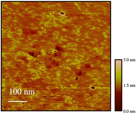 Furthermore, the AFM image shown in Figure 9 clearly demonstrates the presence of isolated macromolecules with no indication of aggregation. This observation eliminates the possibility that PEG19MA could aggregate, as has been found for PBBs prepared with longer poly(ethylene oxide) side chains, which have been shown to crystalize resulting in the formation of crystalsomes [34]. Figure 9 demonstrates that this is not the case for PEG19MA. Although the chains observed in Figure 9 show some curvature, the steric hindrance generated by their side chains prevents them from adopting a fully coiled conformation.