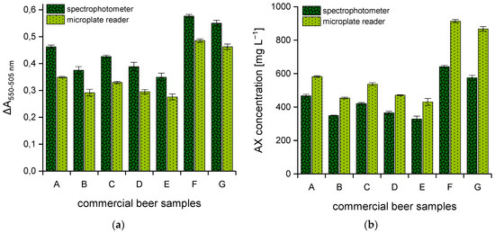 Difference in absorbance (ΔA550–505 nm) of seven commercial German beer samples from various breweries determined using two different photometric systems (n = 3) (a). AX concentrations [mg L−1] were calculated from the corresponding calibration curve (b). Legend: