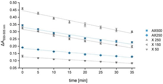 Two control standards (AX250 and 500) and three calibration standards with different xylose concentrations (50, 150, 250 mg L−1) were monitored over a period of 35 min, and the absorbance of each sample was measured every 5 min. A linear regression model relating the absorbance difference (ΔA550–505) to the time was used. A550 is much higher compared to A505 but has a noticeably greater loss rate accordingly leading to a constant decrease in the absorbance difference. Independent of the concentration, all samples showed the same loss rate, entailing a reduction of about 35 ± 3% after 35 min. Consequently, the standard with the highest xylose concentration showed the greatest loss of the absorbance difference over time. Furthermore, it could be observed that the slope of the straight line begins to flatten after half an hour, which may potentially lead to a falsification of the calculated AX values when deferring the measurement time by more than 30 min. Similarly, Kiszonas’s investigations [41] showed a constant decrease in absorbance over time. However, the loss rates were noticeably smaller. Different from our experimental setup, a reference-beam spectrophotometer was used by Kiszonas.
