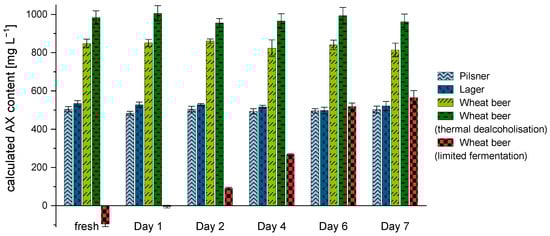 In the non-alcoholic wheat beer (limited fermentation), the calculated AX content increased significantly (p < 0.05) over time from a negative value up to 565.1 ± 36.6 mg L−1. After a period of six days, no further significant increase (p > 0.05) of the calculated concentration could be observed in this sample. In comparison, the bottom-fermented beers (i.e., lager and pilsner) did not show any significant difference (p > 0.05) in AX concentration over the entire fermentation period. In addition, a thermally dealcoholized wheat beer (<0.5% vol.) and a conventional wheat beer containing 5% vol. alcohol were analyzed. When quantifying AX over seven days of fermentation, observations similar to those for the bottom-fermented beers could be made. The AX values of both wheat beer samples remained constant at 814.6 ± 35.9 mg L−1 (conventional wheat beer) and 961.1 ± 40.9 mg L−1 (thermally dealcoholized wheat beer) over the fermentation period (p > 0.05). These results provide evidence that the use of S. diastaticus is able to adjust the underestimation of AX contents by reducing interfering sugars, without affecting the xylose and arabinose response. In the experiments, it could be shown that the fermentation step is absolutely necessary in samples with sugar contents above 3.5 g/100 mL and a total carbohydrate content of 5.0 g/100 mL. Therefore, the use of S. diastaticus is recommended for samples that have not undergone fermentation (e.g., wort) or for which the fermentation was incomplete. The measurements (n = 3 × 2 × 4) were highly reproducible, with a variation coefficient of <5%.