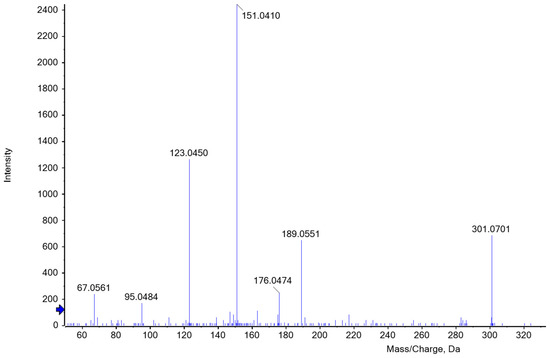 ESI-MS/MS spectrum of [M+H]+ ion (m/z 301.1) of C16H12O6 at a collision energy of 35 eV. C16H12O6 could be one of the most probable furfural phloroglucide derivatives that occur as a red color complex during heat-induced acid hydrolysis of the reaction reagent in the presence of AX.