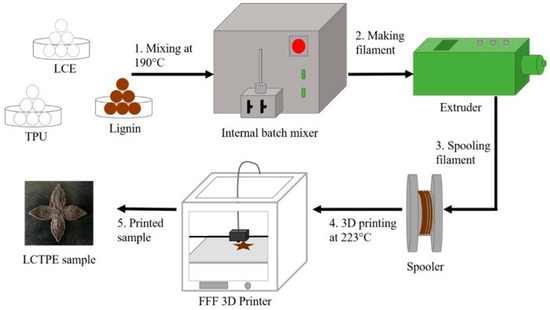 The filaments of the LCTPE and LCTPE/lignin composites were prepared using a single-screw extruder, Filabot EX2 (Filabot HQ, Barre, VT, USA). The LCTPE was extruded at 190 °C with an average diameter of 2.85 mm to be used on an Ultimaker3 FFF 3D printer. The extruded filament was cooled down using two fans at room temperature and spooled using a Filabot spooler. The processes of filament preparation and 3D printing are shown in Figure 1.