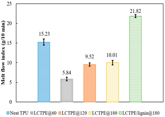 Melt flow index (MFI) test results of the neat TPU, LCTPE@60, LCTPE@120, LCTPE@180, and LCTPE/lignin@180 composite samples at 200 °C.