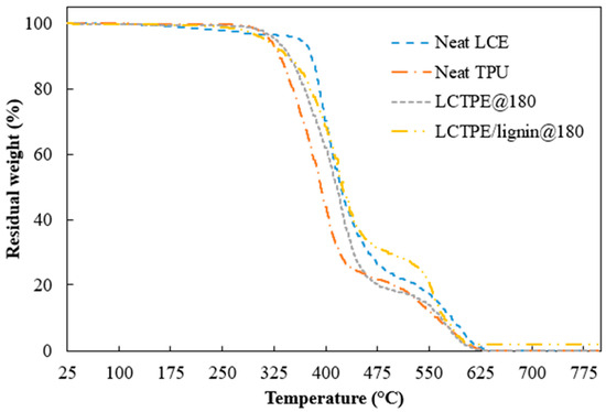 The FTIR curve of neat LCE exhibited a broad peak in a range of 2992 cm−1 to 2842 cm−1, corresponding to intramolecular C-H bond stretching. The peak at 1723 cm−1 indicated a bond stretching of C=O in RM257 structures. The peaks between 1300 cm−1 and 1000 cm−1 specified the C-O-C stretching vibration of the ester groups in the LCE structures. Meanwhile, the LCTPE@180 sample exhibited combined FTIR peaks of LCE and TPU. That combination has no further significant peaks that have been observed. It suggests that the mixture of LCE and TPU was only a result of the physical entanglement between their respective macromolecules. Such an inter-dispersion, however, contributed to a higher shift of the DTG peak of LCTPE@180, which was higher than the neat LCE and TPU, as seen in Section 4.4. A small broad peak at 3330 cm−1 of the LCTPE@180 spectrum was further observed, demonstrating a stretching vibration of the N-H groups of the urethane linkages. The spectrum of LCTPE/lignin@180 composites showed a similar curve to the LCTPE@180 sample. However, a broad peak observed between 3674 cm−1 and 3177 cm−1 corresponded to the O−H stretching of the hydrogen-bonded aromatic and aliphatic groups of lignin structures.
