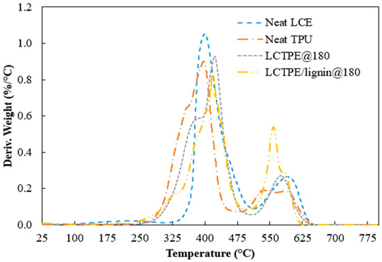 The thermal stability of the neat LCE, neat TPU, LCTPE@180, and LCTPE/lignin@180 composite samples were examined under oxidative conditions. The TGA and DTG thermograms of all the samples are depicted in Figure 6 and Figure 7. All the samples exhibited two degradation stages. The neat LCE sample showed the degradation temperature at 10 wt% loss (Td,10) at 379 °C and the first maximum DTG peak at 403 °C. This degradation stage was ascribed to the breakages of the thioether linkages of the LCE structures and the decomposition of the aliphatic chains of RM257. The second DTG peak of LCE was indicated at 590 °C, corresponding to the fragmentation of the nematic mesogens of the LCE structures. Meanwhile, the TGA curve of the neat TPU showed the Td,10 at 333 °C and the first DTG peak at 400 °C, which corresponded to the scission of the hard segment with the formation of diisocyanate and diol groups. The second DTG peak was in the range of 530 °C to 598 °C, corresponding to the degradation of the soft diol segment of TPU [30,31].