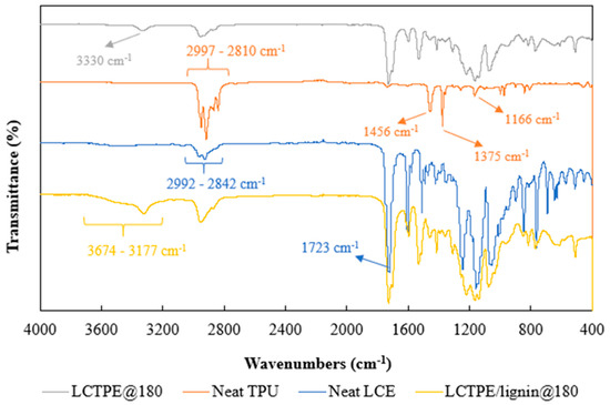 The FTIR spectra of the neat LCE, neat TPU, LCTPE@180, and LCTPE/lignin@180 composite samples are shown in Figure 8. The spectrum of neat TPU showed peaks in the range of 2997 cm−1 to 2810 cm−1, indicating asymmetric and symmetric C-H bond stretching vibrations [32]. The peaks at 1456 cm−1 and 1375 cm−1 belonged to the C-C stretching of aromatic rings and the C-N bond stretching, respectively. The peak observed at 1166 cm−1 corresponded to the NH–(C=O)–O bond stretching vibration of urethane groups [33].