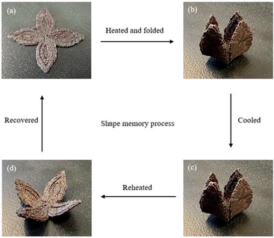 Snapshots of the shape memory process of LCTPE/lignin@180 composite sample: (a) the original blooming shape, (b) the temporary shape folded at 130 °C, (c) the temporary shape cooled at room temperature, and (d) the recovered shape at 130 °C.