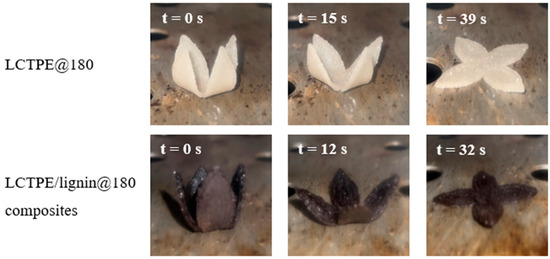 The recovery time of these samples was also investigated by the influence of well-defined temperatures using a video camera. Temporarily folded samples were placed in the oven at different temperatures of 130 °C and 160 °C. The snapshots of the shape recovery behaviour at a temperature of 130 °C are shown in Figure 11. Moreover, the results of the recovery time as a function of temperature are plotted in Figure 12. The LCTPE@180 sample exhibited a full recovery in 39 s and 28 s when activated at 130 °C and 160 °C, respectively. However, the LCTPE/lignin@180 composites could fully recover at 130 °C and 160 °C in 32 s and 24 s, respectively. These results indicate that lignin served as the extra netpoint density, which could store the higher elastic energy in the deformation process and release this energy during the recovery process, resulting in the faster recovery of the composites.