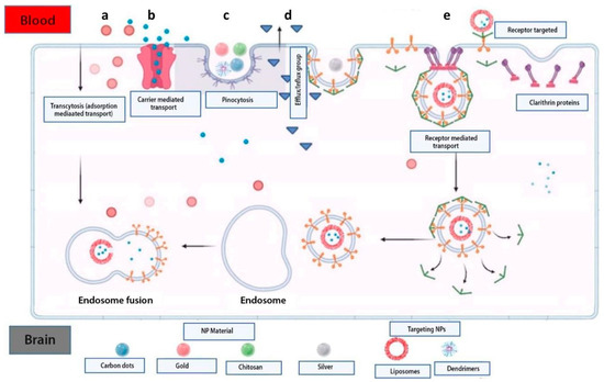 Methods used to overcome the BBB via controlled drug release systems. Nanoparticles based on biopolymers are transported via the cellular adsorption method by electrostatic forces using surface charges (a). Administration of small molecules of active substances encapsulated in nanoparticles using transport mediated by membrane proteins (b). Transport via endocytosis of natural inorganic nanoparticles into the cell (c). Mechanism of the efflux pump that causes drug resistance in the brain (d). Nanoparticle transport using surface receptors such as transferrin and LDL targeting receptors (e) [93].