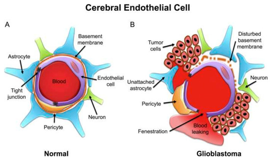 Identifying receptors in the BBB/BBTB offers a promising opportunity for the targeted administration of medications in glioma therapy. When targeting the BBTB, common strategies include focusing on receptors that are abundant in tumors, such as epidermal growth factor receptors and integrins. In order to avoid the BBB, methods such as opening TJs using a hyperosmotic mannitol solution or a chemical (such as bradykinin), blocking efflux drug transporters, and using receptor-mediated drug delivery systems can be employed to enhance the selective release of drugs into brain tumors. Additionally, peptide-coated nanoparticles that increase cell permeability may effectively overcome the BBTB [75,121]. Figure 3 schematically shows the cerebral capillary, showing the normal endothelial cell and in glioblastoma.
