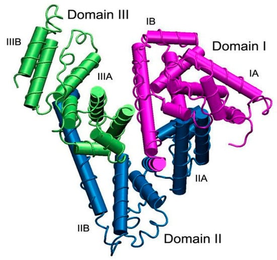 Serum albumin, a globular protein secreted within the body, has some advantages that have attracted the attention of researchers. Albumin is not toxic, is non-immunogenic, ensures excellent biocompatibility with the nanoparticles, and has high stability in water and diluted salt solutions. The half-life of albumin in the bloodstream is 19 days, so the drugs encapsulated in albumin-based nanoparticles can be maintained in the bloodstream for an extended period of time compared with free drugs due to their role in the body, which is to interact with lipophilic molecules, such as hormones, fatty acids, vitamins (C, D, folic acid), and minerals (copper, zinc, calcium). Albumin stabilizes the blood pH and is responsible for 80% of the osmotic pressure of plasma [21,22].