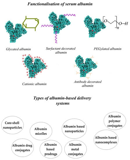 Research carried out until now has shown that various drugs, genes, peptides, vaccines, and antibodies can effectively bind to albumin. This protein can be successfully used to obtain delivery systems with a controlled and targeted release of the encapsulated bioactive compounds. Albumin-based delivery systems have a high drug-loading capacity, good biocompatibility, and biodegradability. Albumin-based nanoparticles are efficient, easy to prepare, have a well-defined and controllable size and shape, and have characteristics for surface modification. Albumin nanoparticles are dried via freeze-drying and could be successfully used in nanomedicine. These nanoparticles can be redispersed in injectable solutions, ensuring the stability of the encapsulated active biological compound and avoiding premature drug release, agglomeration, and precipitate formation [23].