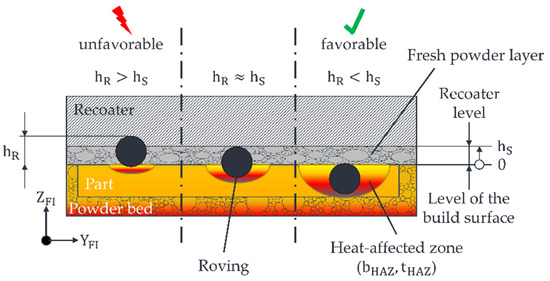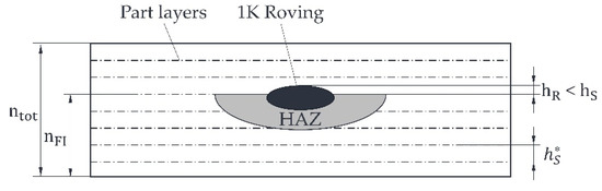 It is crucial to create a HAZ to position the roving below the recoater’s movement level, denoted as (the predetermined layer thickness during the printing process), to ensure the successful integration of rovings. In practical terms, needs to be adjusted to sufficiently immerse the roving in the molten material, meaning should be less than . This configuration avoids the formation of any disruptive contours for the recoater, ensuring process reliability.