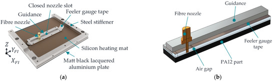 The first term within the parentheses in Equation (2) pertains to Fourier’s law, describing the heat exchange between the ring-shaped fibre nozzle characterised by inner diameter (responsible for guiding and transmitting the roving inside the fibre nozzle), outer diameter nozzle curvature κ, and the surface of the powder bed. It is assumed that heat is exclusively transferred through heat conduction across the air gap, which constitutes a scenario of free convection involving internal flow and heat radiation [18,20]. Under these conditions, the Rayleigh number (Ra) is less than 1, indicating a stable stratified fluid layer with no induced flow (Nusselt number, Nu, equals 1) [23]. The second term within the parentheses in Equation (2) corresponds to the Stefan–Boltzmann law, incorporating an additional radiation exchange between the front surface of the fibre nozzle and the surface of the powder bed. From the standpoint of a stationary point on the part’s surface, signifies the temporal duration during which the heated fibre nozzle with a surface area imparts heat to the part at a feed rate of . The duration for heat transfer can be influenced by the feed rate of the fibre nozzle. It is important to note that potential convection currents between the fibre nozzle and the supplementary heat source and heat dissipation at the peripheries of the additional heat source into the surroundings were assumed but not considered in this analysis.
