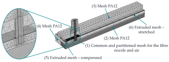 For a detailed description of the mesh specifications, please refer to [33]. The PA12, the front surface of the nozzle, and the air near the nozzle are significantly involved in the heat transfer and the formation of the HAZ. Consequently, a fine mesh is initially assumed there. The nozzle and the air section mesh in a standard mesh using a parameterisable selection cylinder along the rotation axis of the fibre nozzle in COMSOL. The PA12 part is also partitioned. In this way, a correspondingly fine mesh can be selected in the area where the HAZ is formed, and the low-influence areas of the PA12 part can be more coarsely meshed. The guidance, the feeler gauge tape, and the black lacquered metal plate are provided with a coarser mesh. By default, geometries in COMSOL are meshed tetrahedrally. To replicate the one-dimensional movement of fibre nozzle feed along the y-direction, the moving mesh knot is used in COMSOL. The moving mesh knot allows the deformation of the extruded meshes (zones 5 and 6), which realises a relative movement between zones 1 and 2. The extruded mesh in zones 5 and 6, represented by a rectangular mesh, includes the edge zones of the feeler gauge tape, the black lacquered plate of the additional heating mat, and the air. It is assumed that these zones along the extrusion axis have a minor influence on the target variables. The following Figure 5 shows the displacement of the mesh along the y-axis.