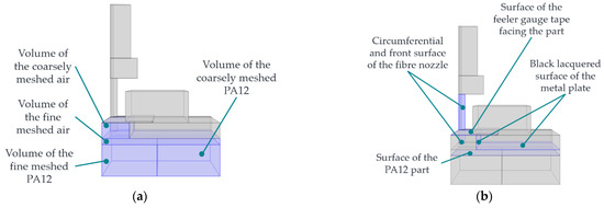 The thermal radiation physics module in COMSOL is applied to all surfaces involved in radiation exchange—see Figure 6b. These include the surface of the black lacquered metal plate, the bottom of the feeler gauge tape, and the surfaces of the PA12 part and the fibre nozzle. The direction of the emitted radiation is determined by the opacity, which is why the radiation exchange takes place through the air areas. The total heat to be transferred according to Equation (2), the multiphysics function heat transport with surface-to-surface radiation, is applied in COMSOL.