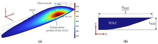 The second term in Equation (1) represents the heat the heated fibre nozzle conveys. This heat flow primarily plays a pivotal role in directing heat energy transfer, thus facilitating the formation of the HAZ. The heat transferred through the fibre nozzle is quantified according to Equation (2).
