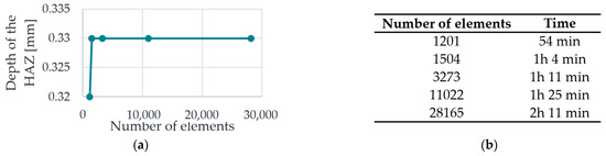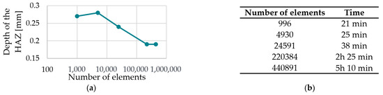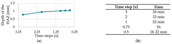 By default, COMSOL Multiphysics defines the time steps Δt = 3 s used to solve a time-dependent problem. The predefined settings, however, lead to irregular HAZs that do not occur in reality. The greater the feed rate of the nozzle, the worse the HAZ reproduced. To counteract this, time steps are given to the temporal solver of the FE model. A further convergence analysis examines the effect of the selected time step on the HAZ—see Section 2.3.1.