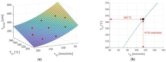 To identify an optimised operating point range for and, in which 365 µm can be achieved, the relationship between is first derived with the help of a central composite design (CCD) with initially widely spaced factor levels. A CCD consists of a full factorial or partial factorial ground plan and a central star. CCD designs have an orthogonal design with a two-stage structure. The two-stage basic design can be evaluated in advance. The star can be used to create both square and cubic models. Such experimental designs are preferably used for the optimisation of target variables. Due to two independent influencing variables and a dependent target variable, the cause–effect relationship of these variables can be described in three-dimensional space. Following the Stefan–Boltzmann law as outlined in Equation (2), it is observed that alterations in temperature exhibit a nonlinear impact on the transferred heat . Therefore, Equation (6) serves as a fundamental framework for comprehensively depicting the linear and nonlinear influences of and on .