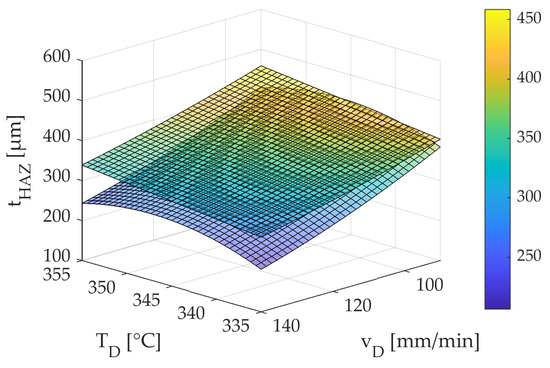 It can be said that the two surface response diagrams are relatively close. The surface response diagrams are further apart for high feed rate values than for lower feed values. Furthermore, it can be seen in Figure 15 that the surface response diagram for Equation (9) drops for both high and lower temperatures. The causes for deviations between the surface response diagrams could be the same as in Section 3.1. In addition, the longer sample geometry could be another reason for a reduced coefficient of determination for Equation (9). Due to the longer length of the samples compared to the samples from the SPD, the samples from the CCD may lie in areas on the powder bed where the heat distribution is no longer constant. The result is an increased pore content of the parts and a reduced value for the depth of the HAZ.