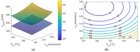 The standard error of the regression (S) for the HAZ depth was notably low, measuring 35.69 µm. Although the coefficient of determination R2 of 0.72 was lower than that of the model presented in Equation (10), it is considered acceptable. In Figure 16a, a surface response plot based on Equation (9) of the FE model (excluding the influence of the roving) was compared with Equation (10) (considering the influence of the roving).