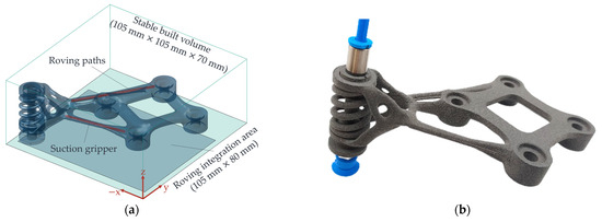 For the experimental validation of the identified and optimised operating points from Table 12, this section involves the production of a battery tab suction gripper with a function-integrated spring, i.e., without subsequent assembly, for agile fuel cell production. Figure 18a shows the 3D model of the suction grip with integrated roving paths (red) inside the struts to be reinforced, which was created using generative design.