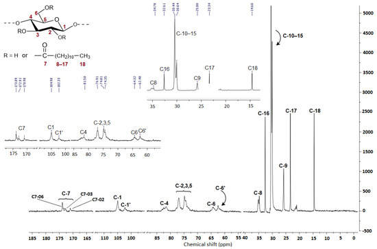 In the 13C NMR spectrum of cellulose laurate, presented in Figure 1, the signals at 34.78, 32.61, 25.80, 23.34, and 14.60 ppm are assigned to carbons of C-8, C-16, C-9, C-17 and C-18 of the aliphatic side chain, respectively. The carbons at C(10-15) give signals starting from 30.44 to 30.04 ppm. The AGU carbons C-1, C-1′, C-4, C-2,3,5, C-6, and C-6′ give signals at 104.98, 102.33, 81.50, 76.91–74.35, 64.32 and 62.68 ppm, respectively. The signals from 173.89 to 170.98 ppm correspond to the carbonyl carbon at C-7, which provides the direct confirmation of the successful attachment of the long-chain fatty acid chain to the cellulose backbone. Three peaks for the carbonyl group indicate that all OH groups at positions 2, 3, and 6 were acylated [19]. According to the ref. [46], by peak integration of carbonyl carbons (C7-O2, C7-O3, and C7-O6), it can be suggested that the partial DSs of C7-O6, C7-O2, and C7-O3 are 0.41, 0.11, and 0.08, and, consequently, the substitution order of the OH group is C7-O6 > C7-O2 > C7-O3.