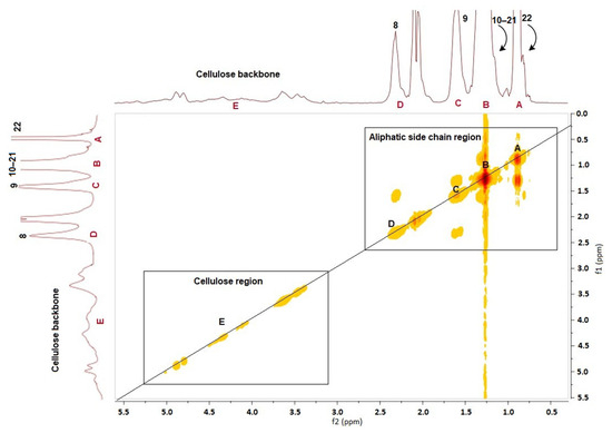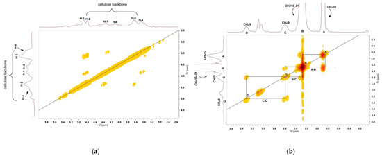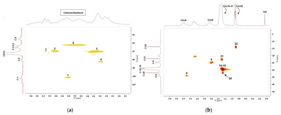 To confirm further the assignment of the signals of cellulose esters, the HSQC spectrum was collected. The example of 1H-13C HSQC for cellulose palmitate is presented in Figure 2, where the cellulose region (Figure 2a) and aliphatic side chain region (Figure 2b) are shown. As can be seen, in the aliphatic side chain region, the correlation of C-21/H-21, C-20/H-20, C-22/H-22, and C-10–19/H-10–19 were located at δH/δC at 1.29/22.54, 1.27/31.76, 0.89/13.90 and 1.26/29.46, respectively. In the cellulose region, the strong correlations were distinguished at δH/δC 5.14/72.17, 4.82/71.93, 4.42/101.59, 4.19/62.34, 3.52/73.06, and 3.36/82.31 for C-3/H-3, C-2/H-2, C-1/H-1, C-6/H-6, C-5/H-5, and C-4/H-4, respectively. The two decentralized signals of C-8/H-8 and C-9/H-9 are represented by δH/δC at 2.32/33.80 and 1.59/24.78, respectively.