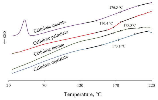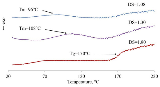 The best DSC curves were obtained for the cellulose palmitate series (see Figure 5), where DS varied from 1 to 1.8. The specimen with DS ≈ 1 represents only fatty acid melting at 96 °C; the specimen with DS = 1.30 shows transient behavior; melting of ester chains at 108 °C coexists with a glass transition of cellulose ester chain above 160 °C. The sample with high DS = 1.80 shows a well-distinguishable glass transition temperature at 170 °C.