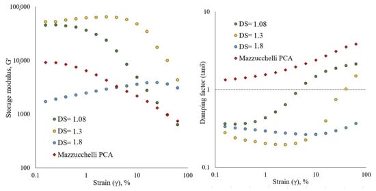Storage modulus (left) and damping factor (right) dependence on strain amplitude for cellulose palmitate with different degrees of substitution.