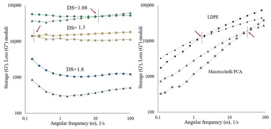 The viscoelastic properties of thermoplastics strongly depend on deformation (dynamic oscillations) frequency. In the frequency range between 0.1 and 100 s−1, studied samples of CP curves represent a rubbery plateau (see Figure 7 left), where storage prevails over loss modulus. The crossover point from the rubbery plateau to the transition region for material with the lowest DS is marked with the red arrow on the plot. At the same time conventional thermoplastic materials, like LDPE and plasticized cellulose acetate (see Figure 7 right), in this frequency range have crossover from transition region to glassy region (crossover point labeled with red arrows). As could be seen, flexible chains of LDPE and externally plasticized rigid chains of cellulose acetate at high frequencies show perfect elastic behavior and turn viscoelastic upon frequency decrease (transition zone). Cellulose palmitates in the whole frequency range show rubbery behavior due to the strong entanglement of macromolecules, which is similar to cross-linked materials. It is worth noting that CP with DS = 1.08 has crossover from rubbery to transition zone at a relatively high frequency—around 10 s−1; these short-range motions could be attributed to plastic deformations of fatty ester branches.