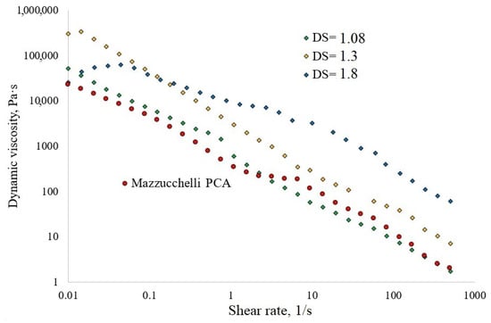 Dynamic viscosity dependence on shear rate for cellulose palmitate with different degrees of substitution.