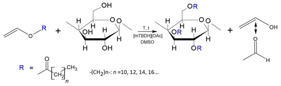 In transesterification reactions, either (a) carboxylic esters [12] or (b) vinyl esters are used as acyl donors [13,14]; in this case, a large excess of the reagents and high temperature are required, and usually a low degree of substitution (DS) is obtained. The by-products of transesterification using vinyl esters as acylating agents are relatively simple compounds like alcohols, aldehydes, and ketones, which can be easily separated and recycled. Transesterification reactions have mostly been performed under heterogeneous conditions, which usually need a long reaction time (from hours to days). Furthermore, in transesterification, a catalyst is necessary to initiate the reaction [4,15], for example, sulfuric acid. In these reactions, the cellulose is not fully solubilized. Therefore, such technologies can be used mostly for the synthesis of short-chain fatty acids (with acyl chains C2–C4) [15].
